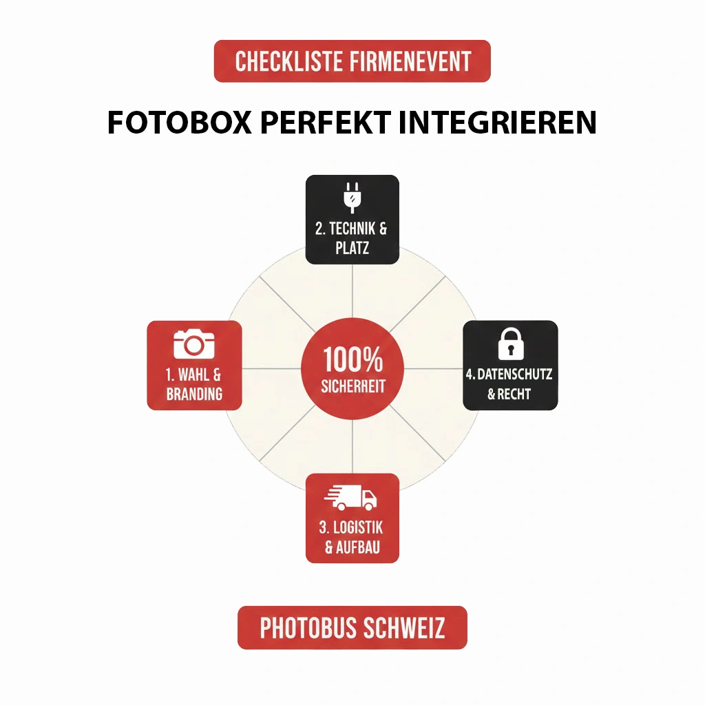 Ein Firmenevent ist erst dann ein Erfolg, wenn die Qualität bis ins kleinste Detail stimmt. Für Eventplaner*innen ist die Fotobox oft mehr als nur Unterhaltung – sie ist ein Tool für Branding, Mitarbeiterbindung und Marketing. Damit bei der Umsetzung nichts schiefgeht, haben wir diesen Guide basierend auf unserer Erfahrung von über 8’000 begleiteten Events erstellt. Diese Checkliste gibt dir die 100%ige Sicherheit, die du für deine Event-Planung benötigst.